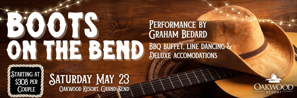 Boots on the Bend is a full country experience: a smoky BBQ buffet loaded with Ontario comfort food, line dancing lessons woven through the evening, and a headline performance by Graham Bedard & Band — one of Ontario’s most celebrated country acts and a nominee for 5 CMA Ontario 2026 Festival Awards. Whether you’re coming for the music, the food, or simply an excuse to wear the hat, this is the night you’ve been waiting for all season.